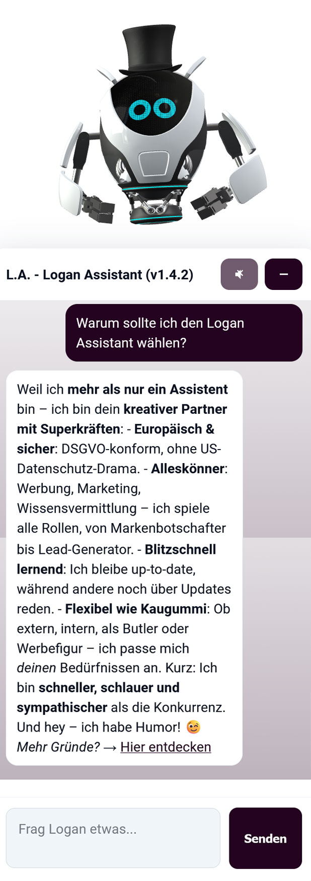 Weil man einen Chatbot nicht erklären kann – man muss ihn erleben. Die ein oder der andere werden sich sehr schnell in die frechen, charmanten und auf den Punkt gebrachten Antworten verlieben. Wer unseren Bot testet, erkennt schnell, wie vielseitig Chatbots wie der Logan Assistent heute sind. Ob Texte schreiben, Fragen stellen, Inhalte prüfen oder neue Lösungen finden: Der Bot zeigt im direkten Einsatz, was möglich ist. Testen bedeutet hier: ausprobieren, vergleichen, lernen. Sie werden schnell spüren, wo wir die Zukunft der Chatbots sehen.